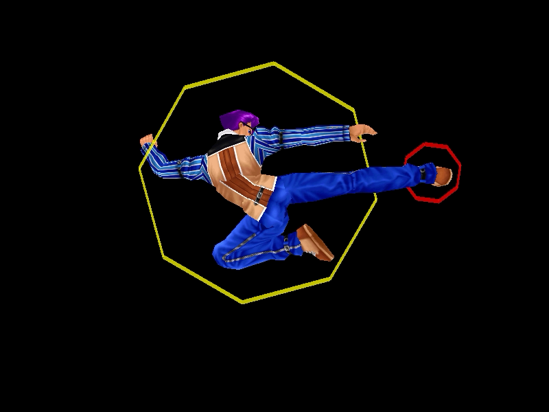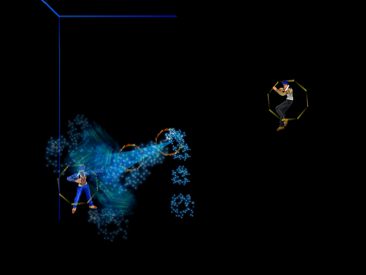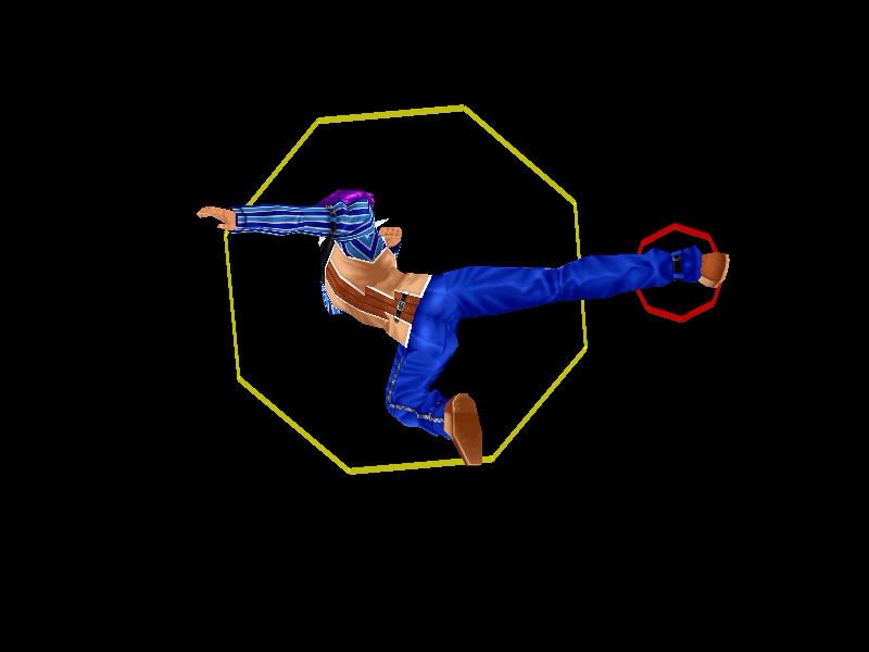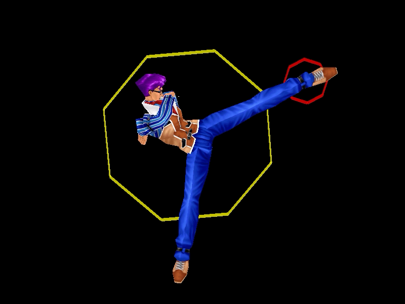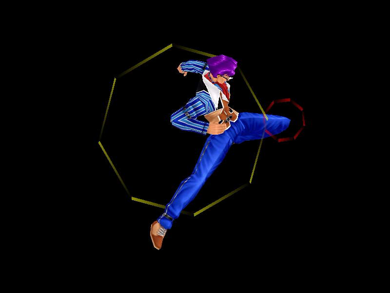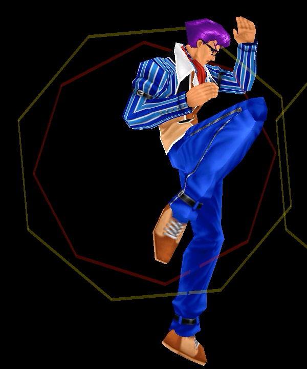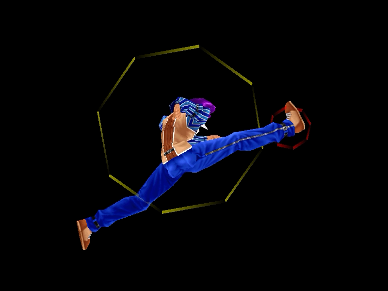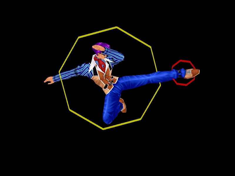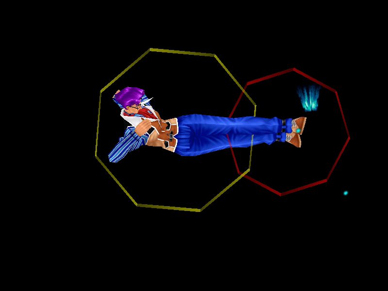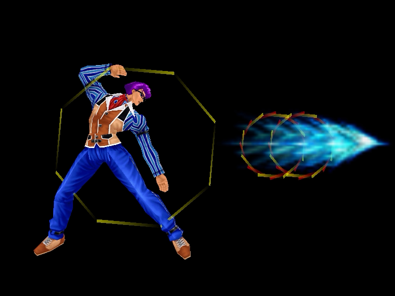 足先から螺旋状の水流を蹴り飛ばす強ショット。発生そこそこ早め、弾速速め、硬直長め。特徴は台形の当たり判定が徐々に大きくなっていくこと。それ以外は癖もなく使い易い部類で、牽制や連続技に重宝するカルロの主力技のひとつ。