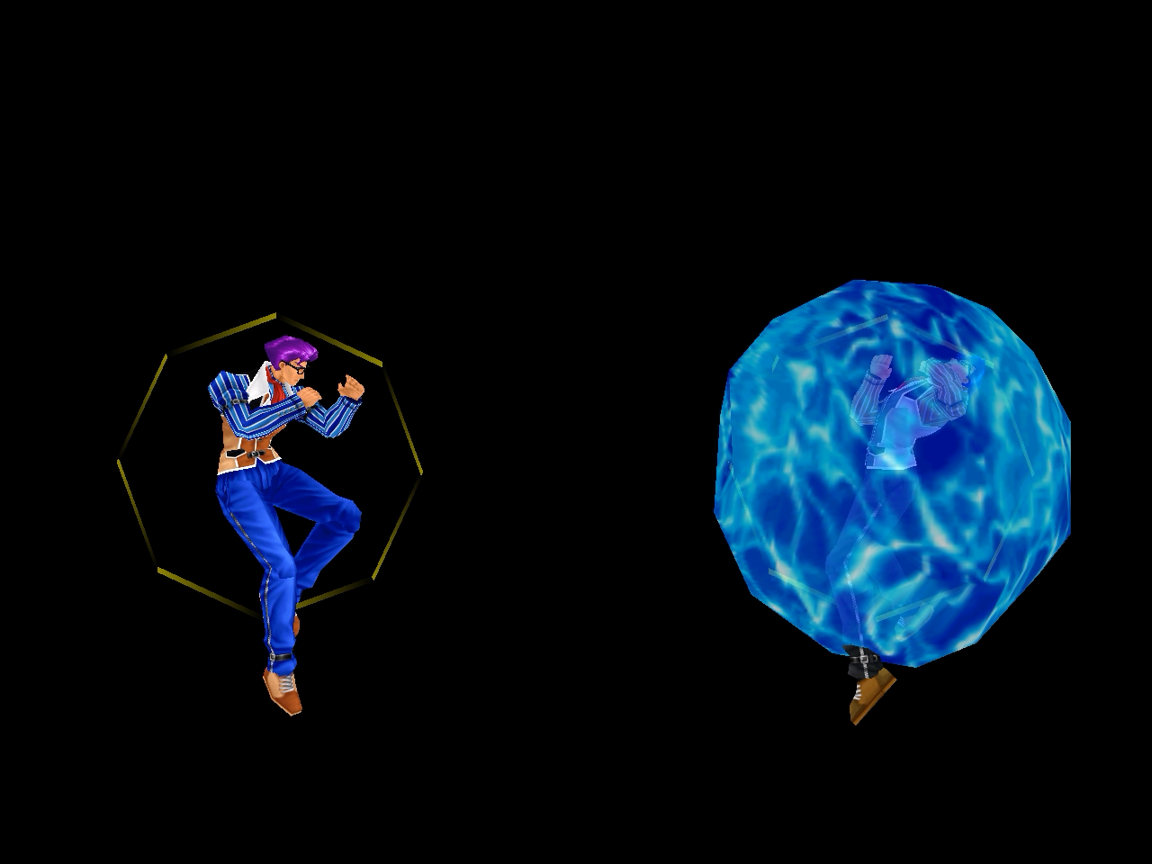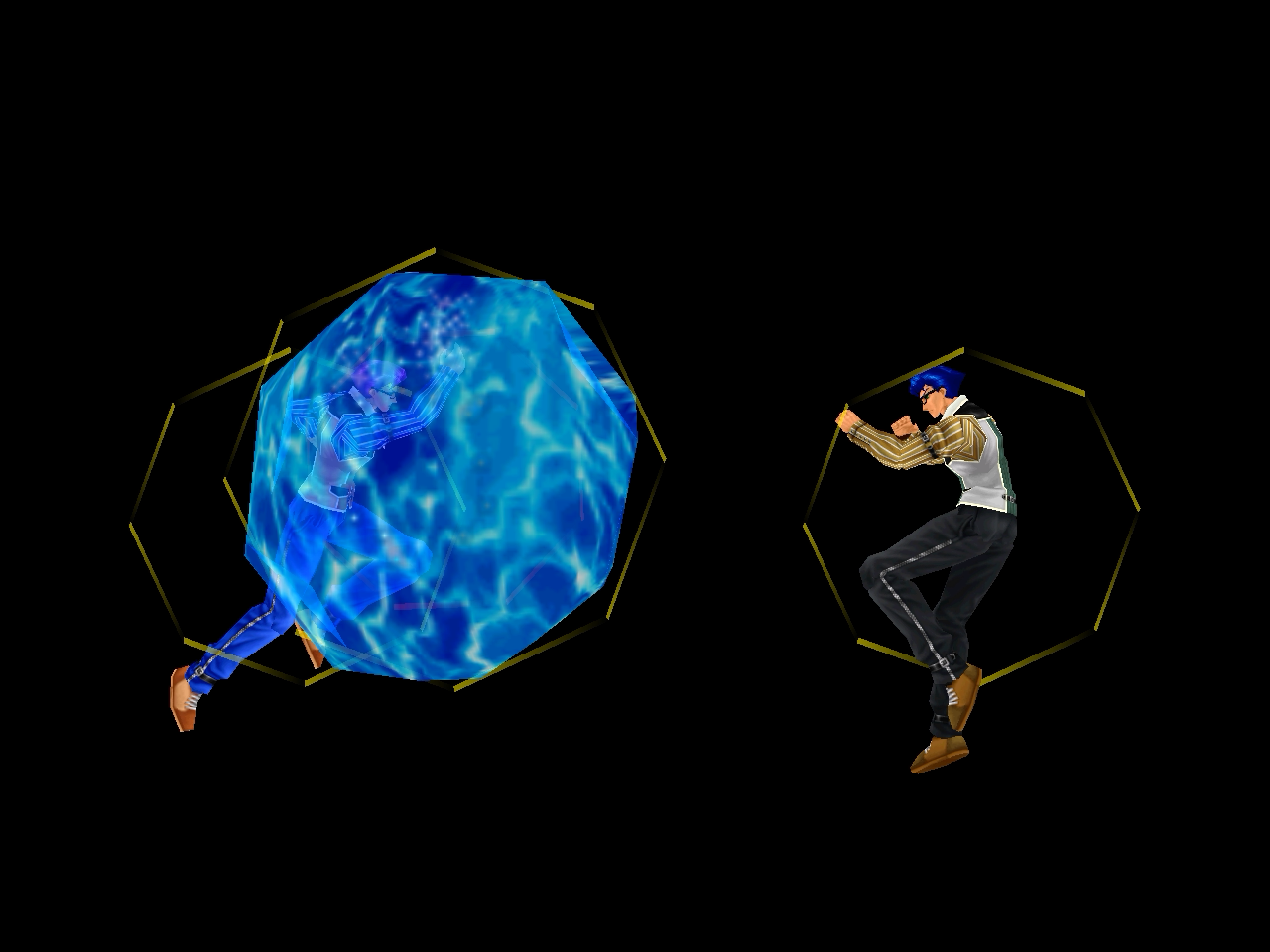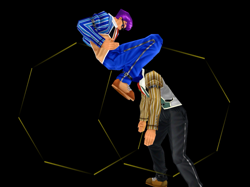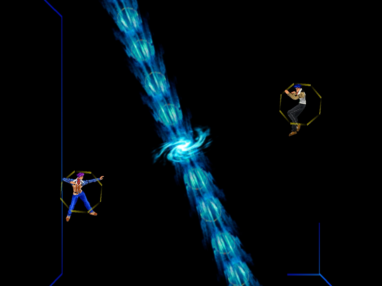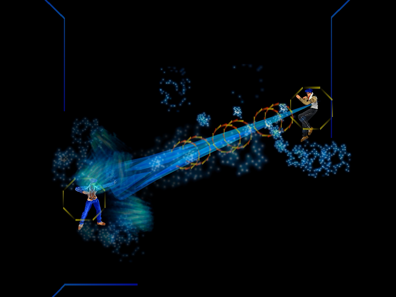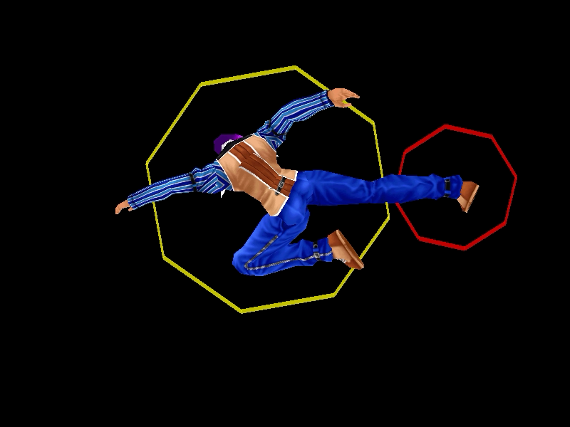 足先から螺旋状の水流を蹴り飛ばす強ショット。発生そこそこ早め、弾速速め、硬直長め。特徴は台形の当たり判定が徐々に大きくなっていくこと。それ以外は癖もなく使い易い部類で、牽制や連続技に重宝するカルロの主力技のひとつ。