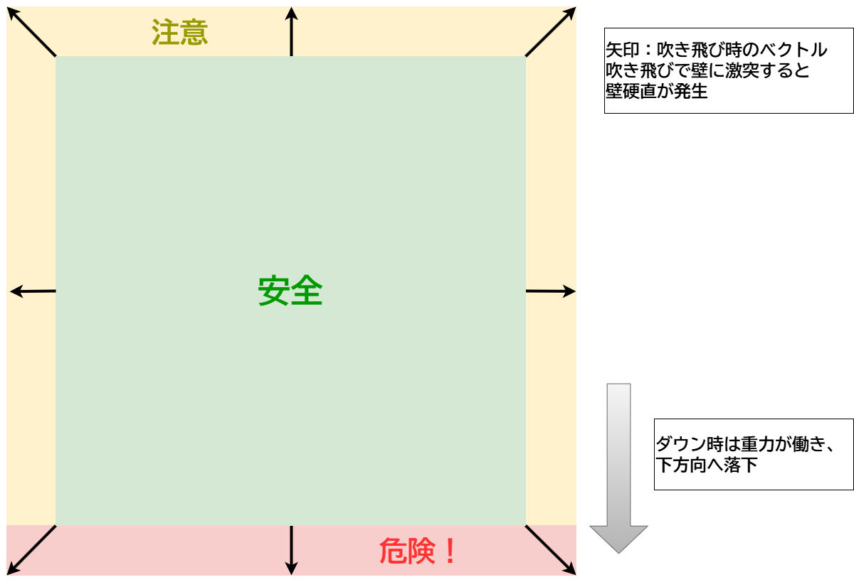 | 被弾種別 | 小吹き飛び壁硬直 | 大吹き飛び壁硬直 | 弱連コンボ壁硬直 | 壁ダウン落下空中 | 壁ダウン底辺 |